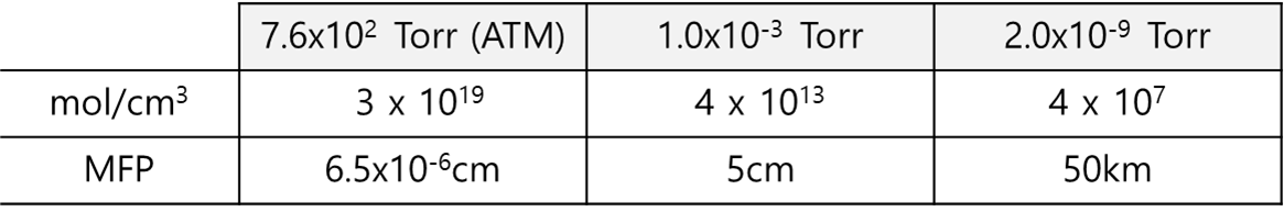 위 표를 보면 압력에 따라 기체 입자의 수가 줄어들고 거기에 따라 MFP 가 늘어나는 걸 알 수 있습니다. (영화 그래비티를 보시면 우주에서 입자가 충격을 받으면 얼마나 빨리 날라가는지 볼 수 있습니다. 이게 바로 MFP가 엄청나기 때문입니다.)